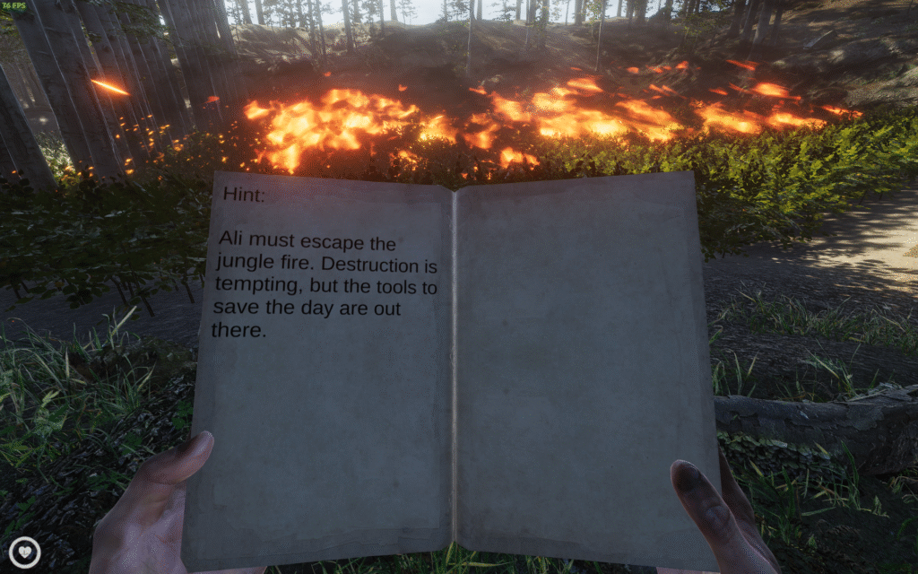 Ali must escape the jungle fire. Destruction is tempting, but the tools to save the day are out there.